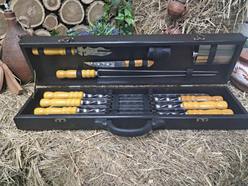 Набор из 6 шампуров для мяса (630х10х3 мм) + комплект аксессуаров в деревянном кейсе