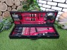 Подарочный набор в который входит все для приготовления шашлыка : 6 шампуров, вилка для снятия мяса, нож охотничий, двойной шампур, барный нож, зажигалка, 4 тарелки, 4 вилки, 4 ножа для стейка, фляга, набор рюмок.