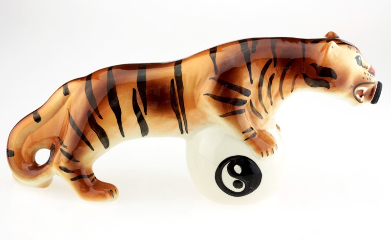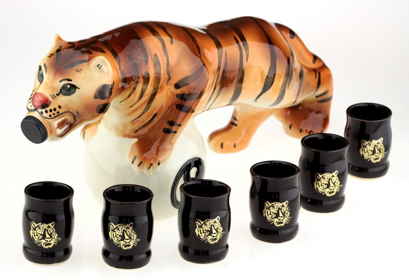 Элегантный тигр является графином-штофом, вместимостью 1,5 литра. А пробка графина находится в «пасти».