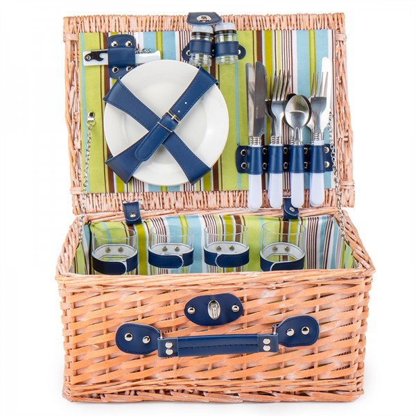 Набор для пикника Корзина Викенд на 4 персоны с ковриком для пикника. Корзина достаточно просторная и содержит 4 набора посуды. Вы также можете разместить необходимую еду и напитки. Корзина для пикника не только красива и украсит Ваш праздник, но и экологична, безопасна для окружающей среды. Корзина для пикника включает: 1 штопор (нержавеющая сталь), солонка и перечница (пластик), 4 столовых ножа, вилки и ложки (нержавейка с полипропиленовой ручкой), 4 тарелки 17,7 см (керамика), 4 бокала (пластик). Аксессуары внутри обернуты защитной бумагой и закреплены кожаными ремнями.
