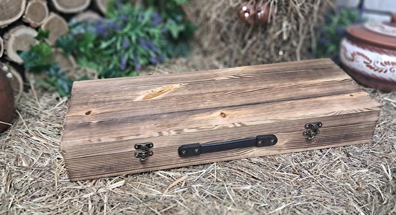 Ящик-кейс для хранения и перевозки шампуров из натурального дерева (650х260х100), материал: обожженная сосна.