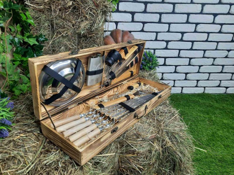 Набор из 6 шампуров для мяса (600х10х3 мм) + комплект аксессуаров в деревянном кейсе