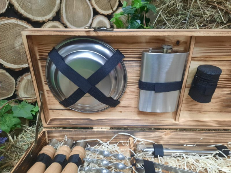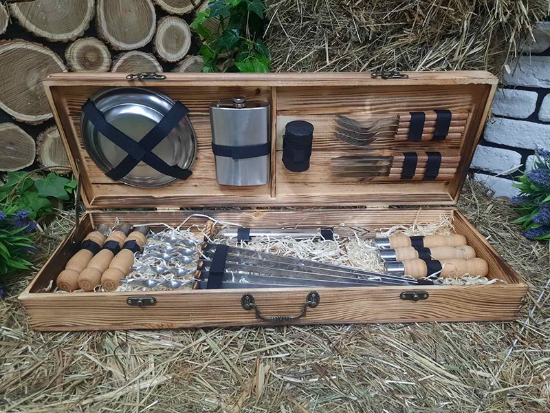 Комплексный набор , в который входит все для приготовления шашлыка: 6 разборных шампуров, набор из 4 рюмок, фляга, 4 тарелки, 4 вилки, 4 ножа для стейка, щипцы для гриля,