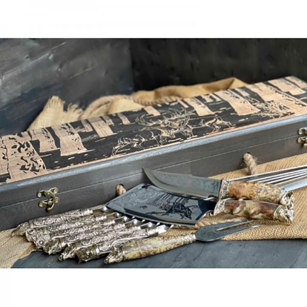 Шампура Дикие звери расписном кейсе из бука.Шампура +нож+вилка +секач.
