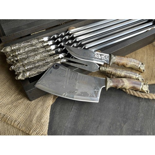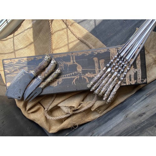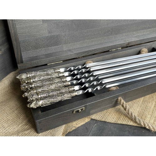 4. Шампура: 6 штук, твердая пищевая нержавеющая сталь толщиной 3 мм. Длина шампура: общая - 69 см; рабочая -45 см Рукоять: ювелирное художественное литье из бронзы (при использовании ручка не нагревается).