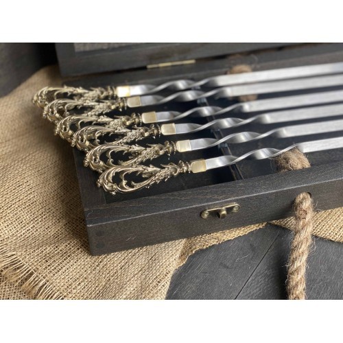 3. Шампура: 6 штук, твердая пищевая нержавеющая сталь толщиной 3 мм. Длина шампура: общая - 60 см; рабочая -40 см Рукоять: ювелирное художественное литье из бронзы (при использовании ручка не нагревается).