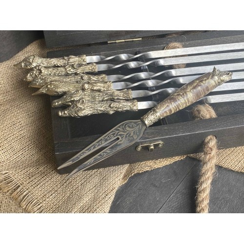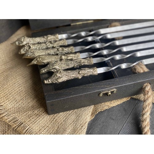 4. Шампура: 6 штук, твердая пищевая нержавеющая сталь толщиной 3 мм. Длина шампура: общая - 60 см; рабочая -40 см Рукоять: ювелирное художественное литье из бронзы (при использовании ручка не нагревается).