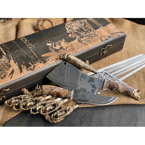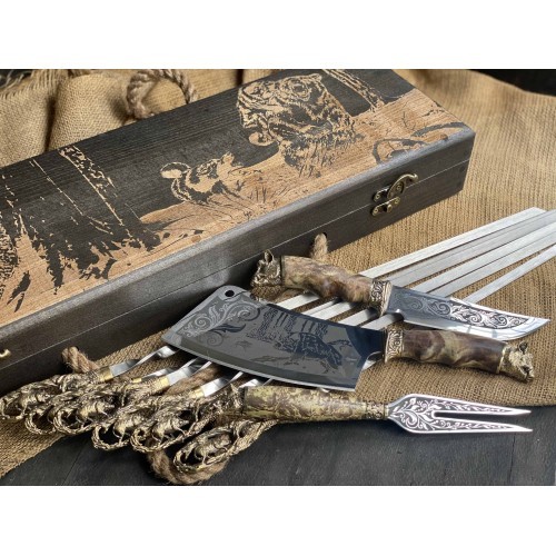 Представляем вашему вниманию нашу новинку-расписные кейсы с различной комплектацией. Наборы могут быть укомплектованы по вашему предпочтению(шампура в кейсе, шампура+ вилка ,шампура + нож, шампура + нож + вилка, шампура +вилка+ нож+ секач , шампура +секач), или можем вам предложить наборы в уже готовых комплектациях. Доступные рисунки для заказа на кейсе: Два на одного(волки и медведь),Царь леса(Лось) , Львиная схватка. Рисунок выполнен методом лазерной гравировки по дереву. возможно добавление гравировки инициалов или поздравления.(по запросу у менеджера. стоимость дополнительной гравировки +200грн)