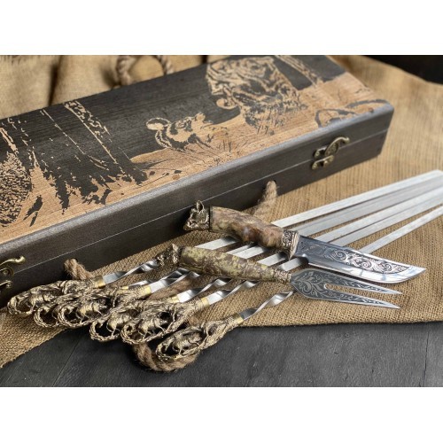 Представляем вашему вниманию нашу новинку-расписные кейсы с различной комплектацией. Наборы могут быть укомплектованы по вашему предпочтению(шампура в кейсе, шампура+ вилка ,шампура + нож, шампура + нож + вилка, шампура +вилка+ нож+ секач , шампура +секач), или можем вам предложить наборы в уже готовых комплектациях. Доступные рисунки для заказа на кейсе: Два на одного(волки и медведь),Царь леса(Лось) , Львиная схватка. Рисунок выполнен методом лазерной гравировки по дереву. возможно добавление гравировки инициалов или поздравления.(по запросу у менеджера. стоимость дополнительной гравировки +200грн)
