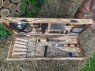 Комплексный набор в который входит все для приготовления шашлыка: 6 шампуров, универсальный нож для мяса, массивная топорика, вилка для снятия мяса, набор рюмок, фляга, газовая зажигалка, 4 тарелки, 4 вилки, 4 ножа.