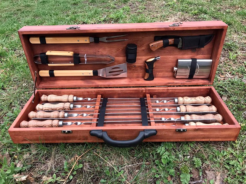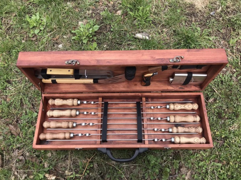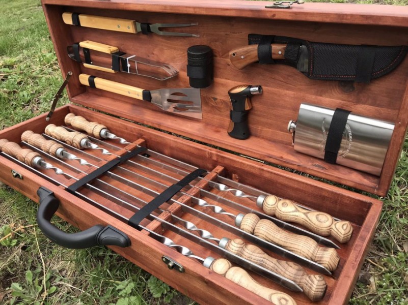 Комплексный набор в который входит все для приготовления шашлыка: 8 шампуров, чем охотничий, газовая зажигалка, фляга, набор рюмок, набор инструментов для гриля (щипцы, лопатка, вилка).