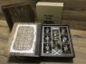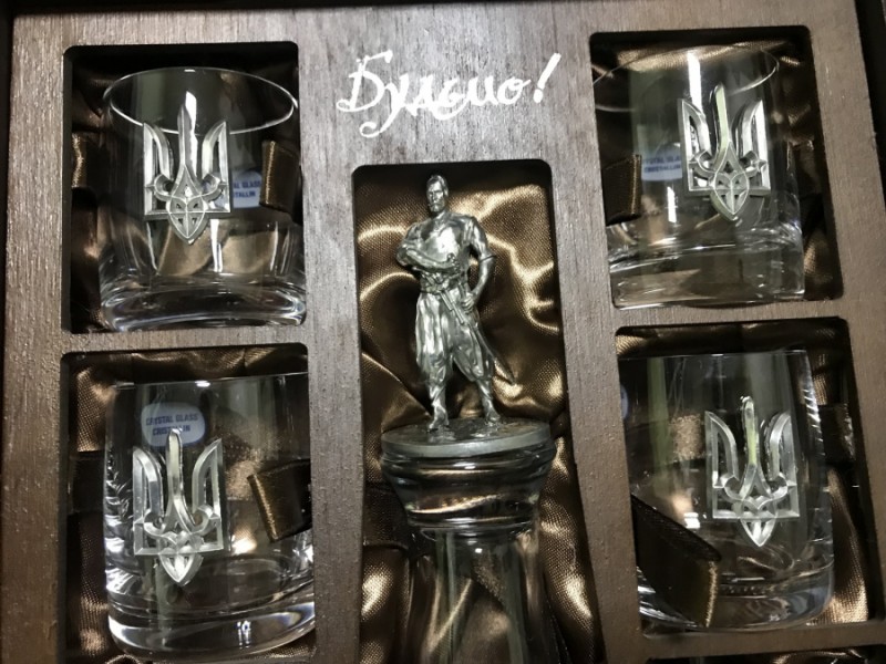 В набор входит 6 рюмок по 60 мл. отделанных накладками в виде трезубца из пищевого олова. И "штрафной" рюмки 60 мл., украшенной казаком.