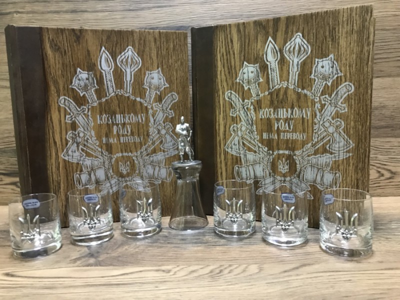 Подарочное издание с рюмками Казацкий род, изготовлено из дуба и стилизовано под старину.