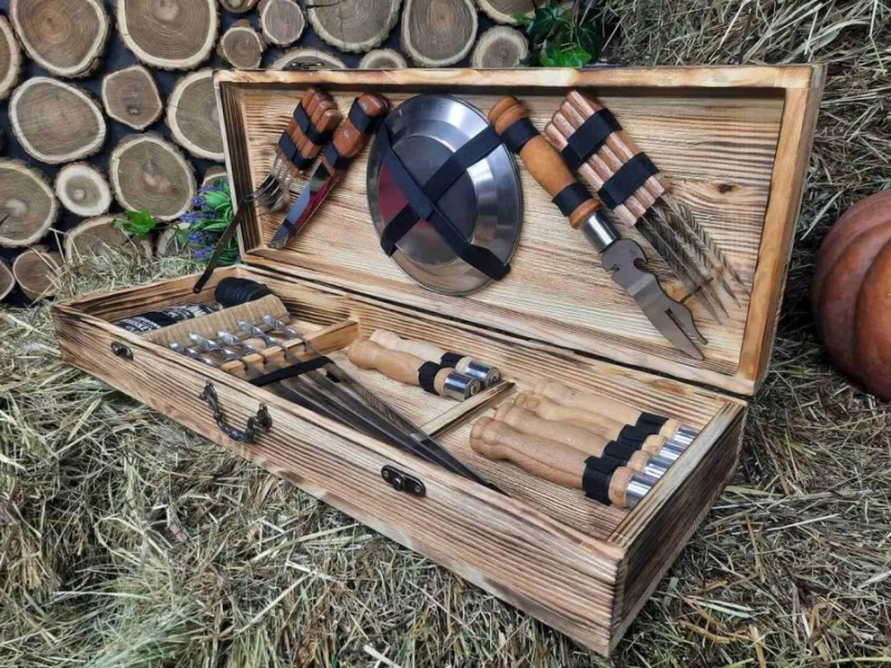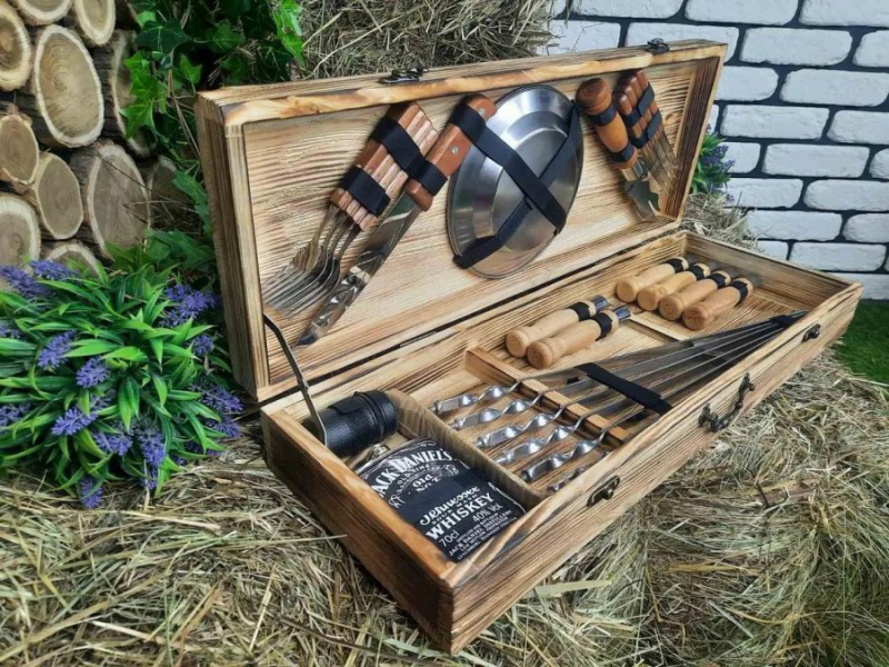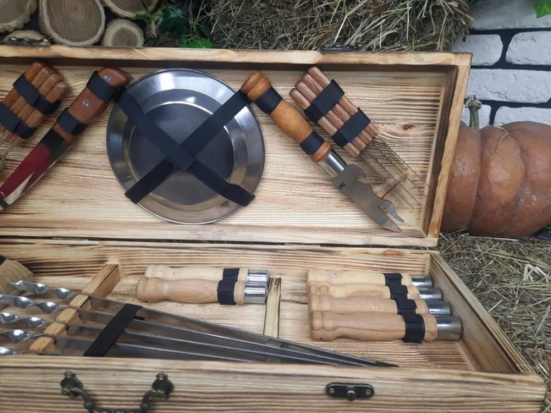 Комплексный набор в который входит все для приготовления шашлыка: 6 шампуров, чем мясника, вилка для снятия мяса, набор рюмок, фляга, 4 тарелки, 4 вилки, 4 ножа для стейка.