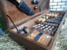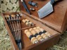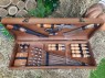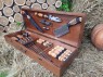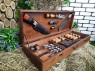 Комплексный набор , в который входит все для приготовления шашлыка: 6 шампуров, набор из 4 рюмок, фляга, чем охотничий в чехле 30 см, шар-зажигалка, штопор и топорик для мяса.