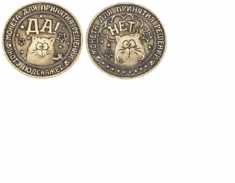 Сувенирная монета Коте подскажет поможет решить любой ваш спор. Просто подбросьте монетку и она даст вам ответ. Имеет смешные изображения кота с двух сторон и надписи Да!, Нет! А также это прекрасная возможность порадовать друзей и близких, подарив такой маленький по размеру, но весомый по значению подарочек. Для этой штучки всегда найдется место в вашем кармане или кошельке. Монета покрыта бронзой и устойчива к истиранию. Диаметр сувенирной монеты 3 см