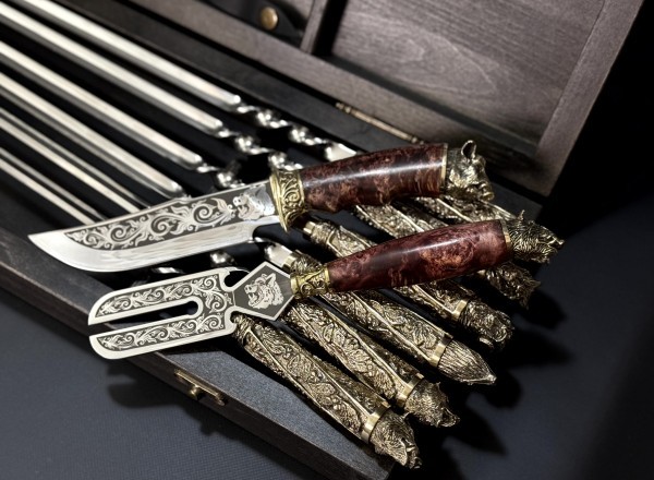 Рукоять: ювелирное художественное литье из бронзы с головами животных "Медведь", "Кабан", "Сова", "Орёл", "Баран", "Волк" (при использовании ручка не нагревается).