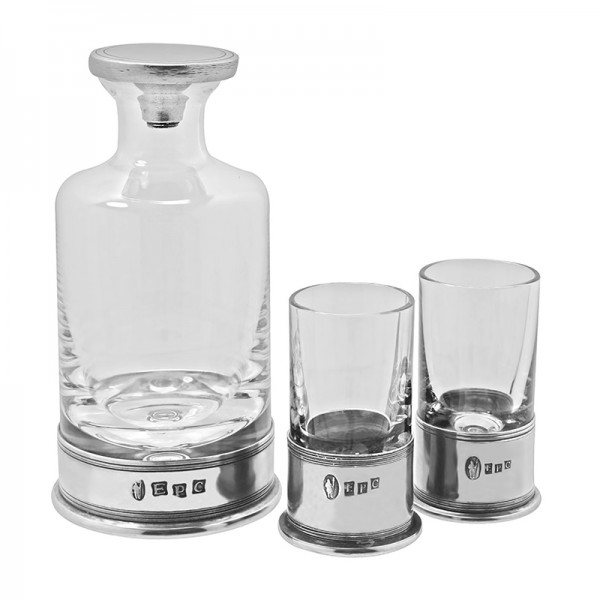 Этот подарочный набор производства компании English Pewter (Шеффилд, Англия) включает в себя стеклянный декантер с пробкой (объемом 180 мл, высотой 13,5 см), а также две элегантные рюмки. Окантовка основания декантера и рюмок, а также пробка выполнены из пьютера (сплава олова и меди). Комплект поставляется в подарочной коробке.