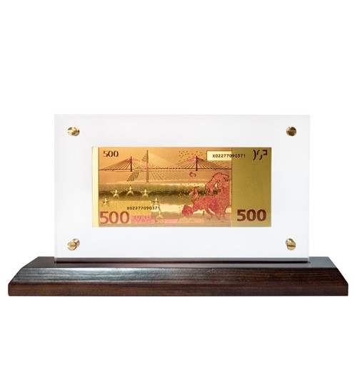 Банкнота 500 EUR (евро) Евросоюз - отличный подарок руководителю, банкиру, бухгалтеру или напрямую имеет дело с деньгами. Под прозрачным двухслойным стеклом на подставке из натурального дерева расположена сувенирная купюра 500евро. Покрытая сусальным золотом 999 пробы. Выглядит очень дорого и прилично. Хорошо смотрится на рабочем столе в офисе, книжной полке и т.д.