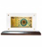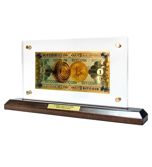 Под прозрачным двухслойным стеклом на подставке из натурального дерева расположена сувенирная купюра 1 БИТКОИН . Покрытая сусальным золотом 999 пробы. Выглядит очень дорого и прилично. Хорошо смотрится на рабочем столе в офисе, книжной полке и т.д.