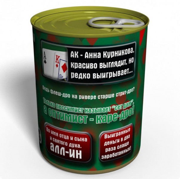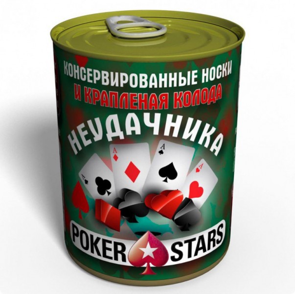 Покер - одна из самых распространенных карточных игр в мире. И если у вас есть покерист, то вы можете порадовать его необычным подарком, который мы сделали именно для игроков в покер - Консервированные Носки И Крапленые Карты Профессионала PokerStars. В свою очередь, Покерстарс является лидером среди организаторов покерных турниров и онлайн игр, и практически каждый игрок знает или играл в pokerstars.