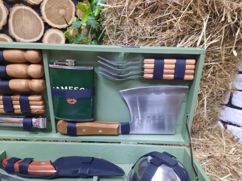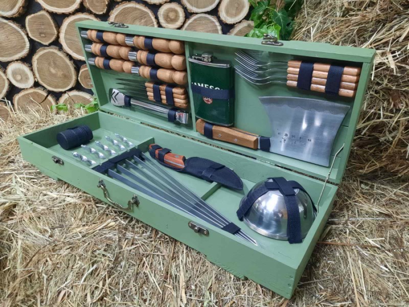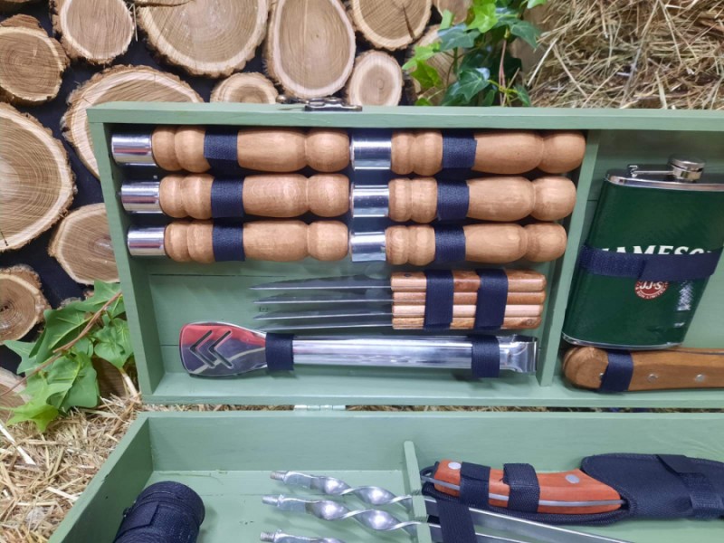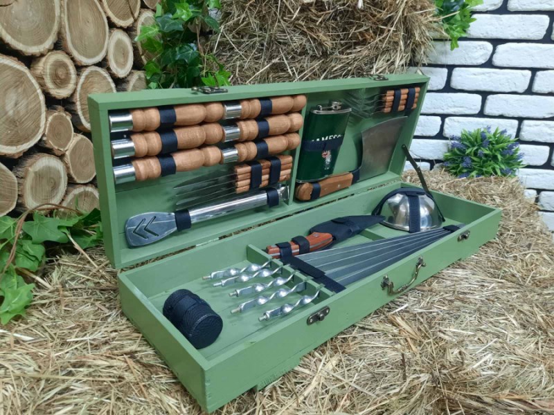 1. Шампура: 6 разборных! шампуров из нержавеющей стали (650х12х2,5 мм). Ручки выточены из жесткого бука, тонированы и покрыты масловоском.