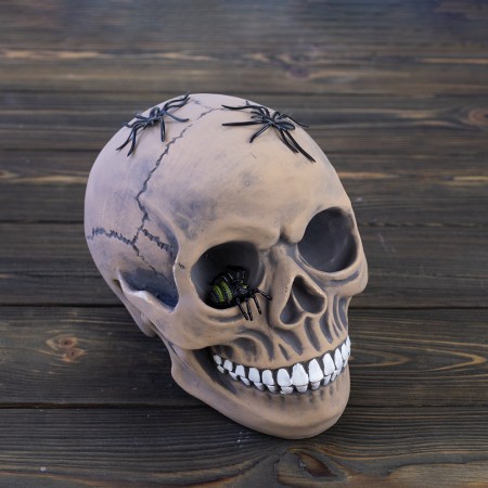 Череп копилка с пауками М, №10603 - креативная копилка в форме черепа, оригинальный подарок на Хэллоуин. Особенно необычно и эффектно в копилке смотрятся естественные швы на стыке костей черепной коробки с пауками и белоснежные зубы.