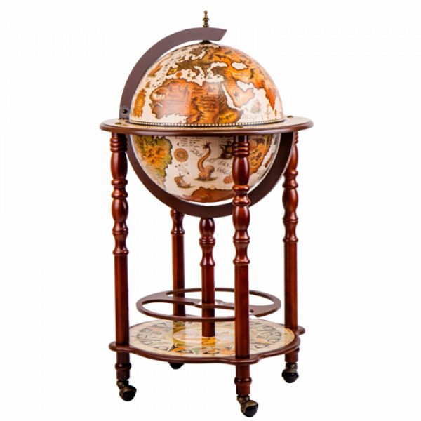 Глобус бар –это компактная и стильная конструкция на колесах, которая вращается вокруг своей оси как настоящий глобус и раскрывается внутри, где есть внутренние полки для хранения алкоголя и барных аксессуаров.