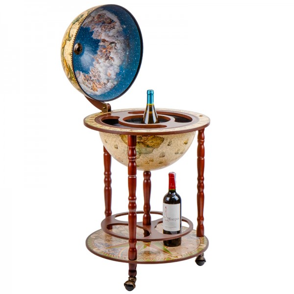 Глобус бар – эстетический и функциональный кейс для алкоголя в форме глобуса. Это компактная и стильная конструкция на колесах, которая вращается вокруг своей оси как настоящий глобус и раскрывается внутри, где есть внутренние полки для хранения алкоголя и барных аксессуаров.