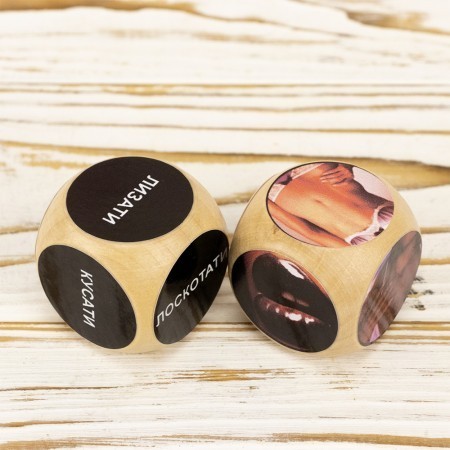 Кубики семейные женское блаженство (укр.) – станут оригинальным подарком для взрослых и разнообразят вашу любовную жизнь. Кубики выполнены из дерева с нанесением печатных 6 действий и 6 локаций на украинском языке, в которых вы можете испробовать выпавшие позы. Кидайте кости и следуйте выпавшим комбинациям: поцелуйте живот, щекочите грудь, лизните попу.