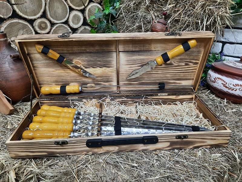 Набор из 6 шампуров для мяса (630х10х3 мм) + комплект аксессуаров в деревянном кейсе