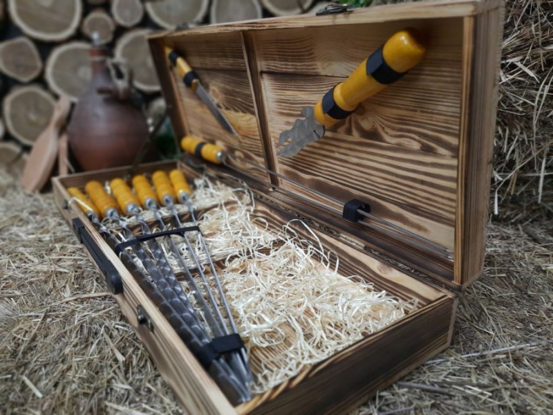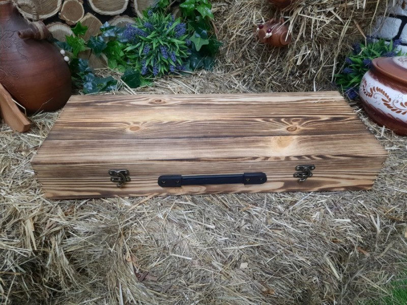 Ящик-кейс для хранения и перевозки шампуров из натурального дерева (650х260х100), материал: обожженная сосна.