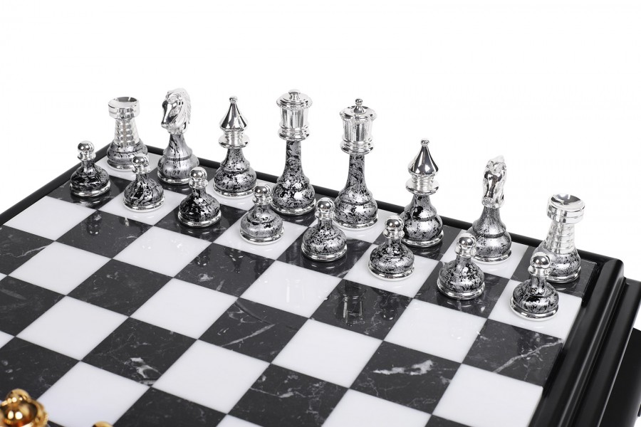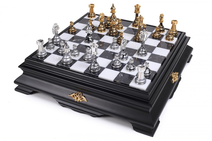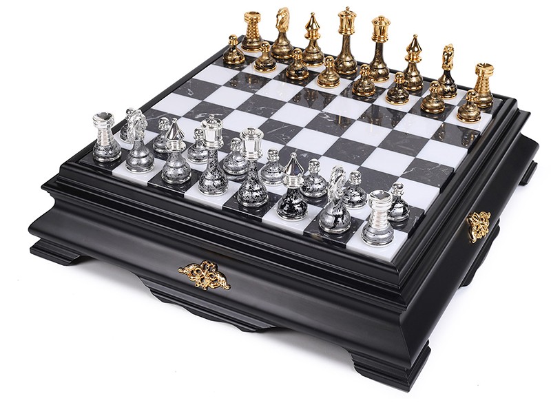 Доска изготовлена из дерева и мрамора с выдвижной шухлядкой для хранения фигурок.