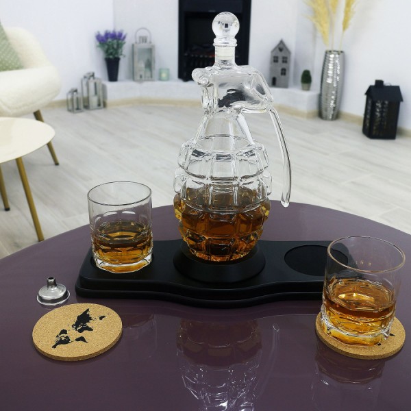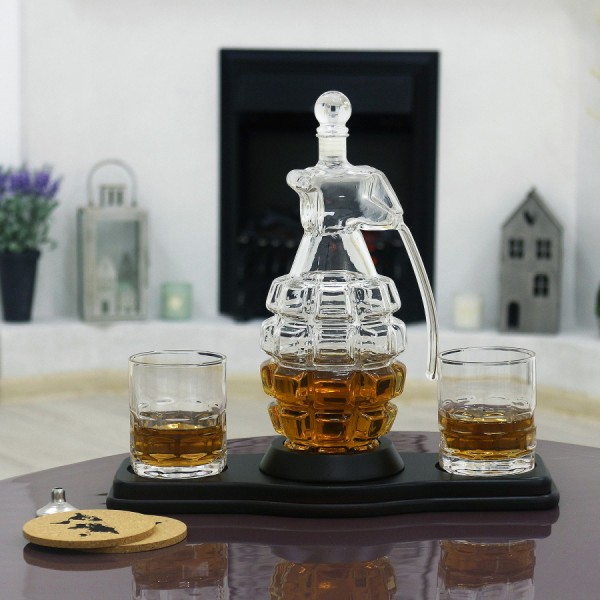 Стеклянный декантер (850 мл): Впечатляющий графин в форме гранаты, символизирующий силу, решительность и готовность к действиям. Он станет центральным элементом любого бара, привлекая внимание своей уникальностью.