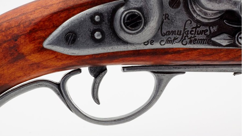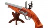 Репродукция кремневого пистолета из дерева и металла с имитацией механизма зарядки и выстрела. Кременные пистолеты, один из наиболее часто используемых пиратами огнестрельного оружия в восемнадцатом веке, имел кремень или кремневый камень, который, когда его запускал молоток, создавал искру, которая зажигала прах. Все эти ружья требовали перезарядки патронов вручную после каждого выстрела. Боеприпасы, вводимые через горловину ствола, состояли из пороха, снаряда и бумажного колпака, служившего крышкой для содержания двух предыдущих материалов, сжатых внутри ствола.