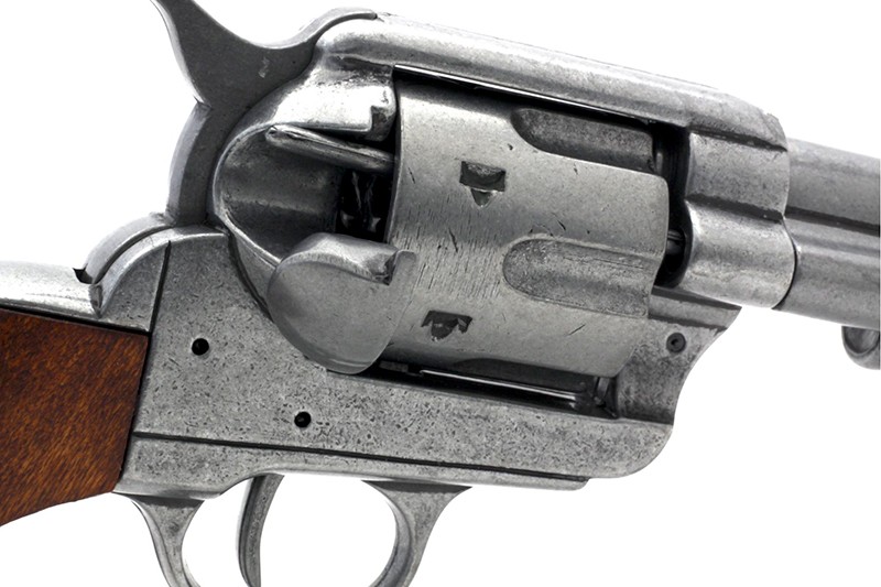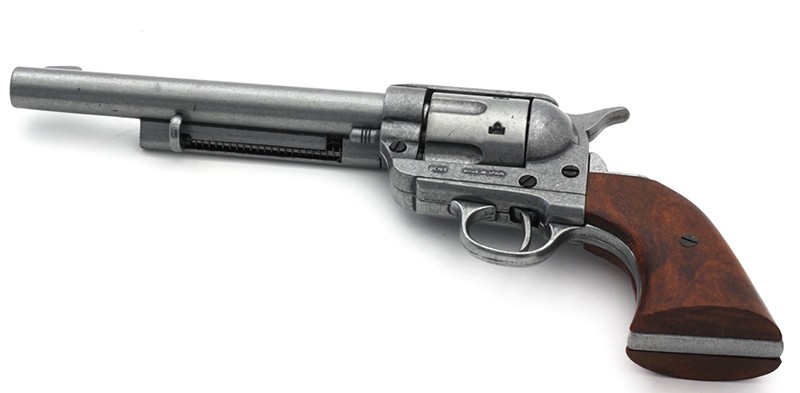 Репродукция револьвера калибра .45 калибра, сделанная из металла и дерева, с имитацией механизма зарядки и стрельбы и вращающимся барабаном.