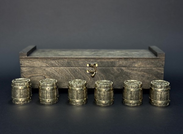 1. Рюмка Бочка: художественное литье из бронзы, внутри покрытые пищевым булатом. Высота 60 мм, ширина 40 мм, объем 30 мл, вес 200 грамм.