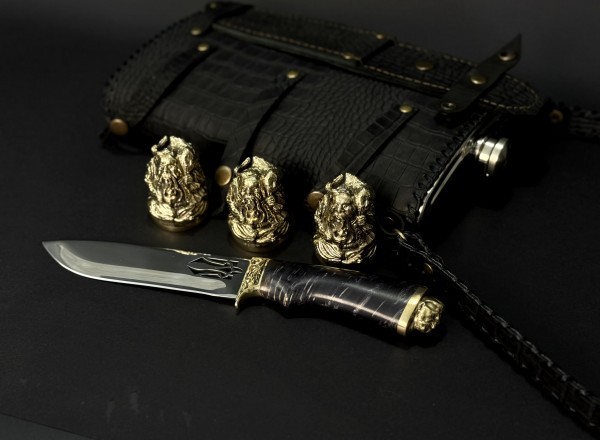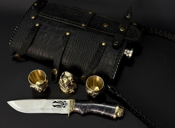 2. Нож ручной работы: рукоять – дерево кленовый кап; материал литья – бронза; лезвие нержавеющая сталь марки 40х13; размер клинка-150*38*2.4. Ножни – натуральная кожа.