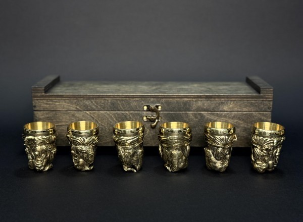 1. Рюмка Козак: художественное литье из бронзы, внутри покрытые пищевым булатом. Высота 70 мм, ширина 40 мм, объем 30 мл, вес 220 грамм.