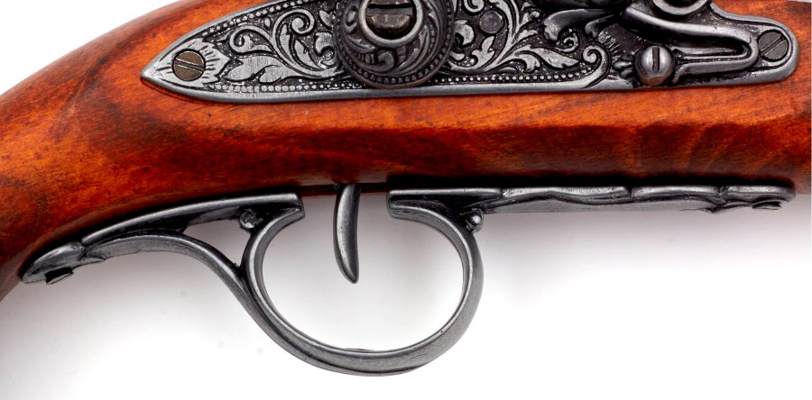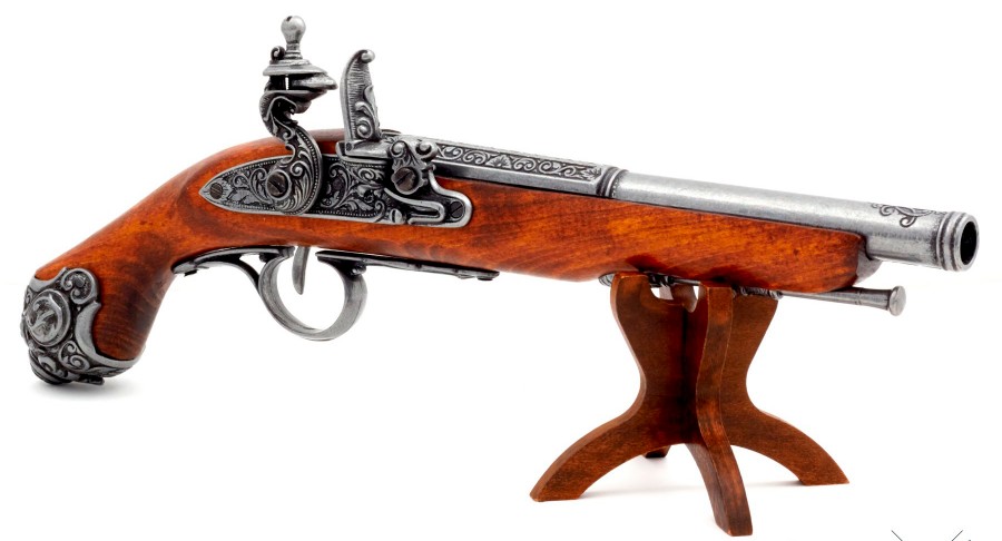 В бою обычно это оружие использовали для одиночного выстрела, поскольку способ перезаряжания был очень медленным и обычно не хватало времени на перезарядку. Поэтому бойцы после стрельбы были вынуждены обнажать сабли или шпаги или использовать пистолет в качестве блэкджека, поскольку обстоятельства не позволяли вовремя их перезарядить. Репродукция кременного ружья из металла и дерева с имитацией механизма зарядки и выстрела.