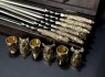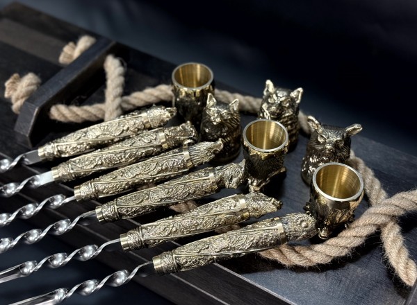 1. Рюмка Охотничья 6 шт: художественное литье из бронзы, внутри покрытые пищевым булатом. Высота 70 мм, ширина 40 мм, объем 30 мл, вес 220 грамм. 6 шт: Кабан, Медведь, Лось, Сова, Рысь, Баран.