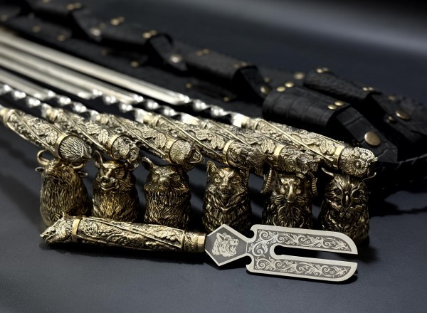 2. Шаммуры 6 шт: лезвие твердая пищевая нержавеющая сталь; рабочая часть 460 мм; завиток 100 мм; рукоять 140 мм; общая длина 700 мм; ширина 12 мм; толщина 3 мм; на рукояти дерево ясень с головами различных зверей.
