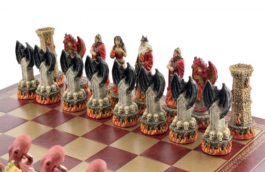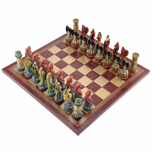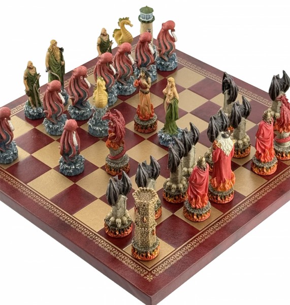 Эта завораживающая коллекция изображает вечный конфликт между противоположными стихиями. С одной стороны доски мы видим таинственных созданий морских глубин – осьминогов, русалок и других фантастических водных существ. Кроме того пылают драконов огонь и воины стихии пламени.