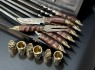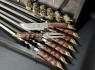 4. Шаммуры 6 шт: лезвие твердая пищевая нержавеющая сталь; рабочая часть 460 мм; завиток 100 мм; рукоять 140 мм; общая длина 700 мм; ширина 12 мм; толщина 3 мм; на рукояти дерево ясень, головы Щук - художественное литье из бронзы