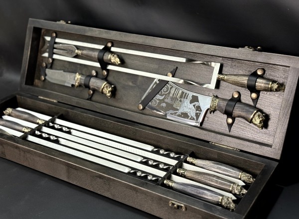 Комментарии к Набор Охотничий с секачом, ножом, вилкой и двойным шампуром в деревянном кейсе