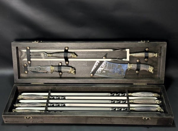 Набор Охотничий с секачом, ножом, вилкой и двойным шампуром в деревянном кейсе