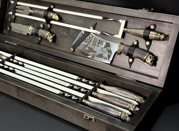 Характеристика набор Охотничий с секачом, ножом, вилкой и двойным шампуром в деревянном кейсе