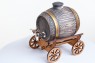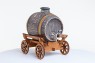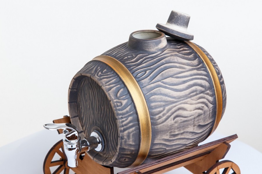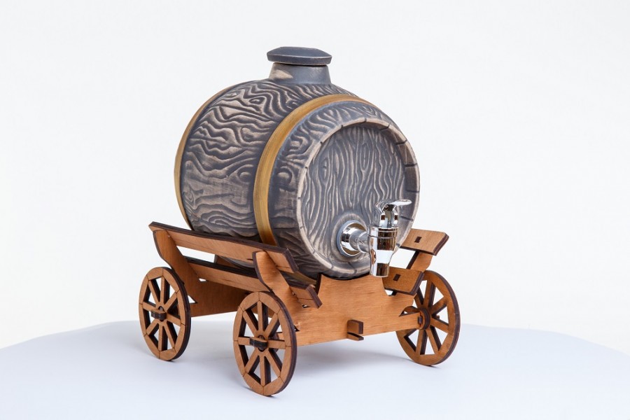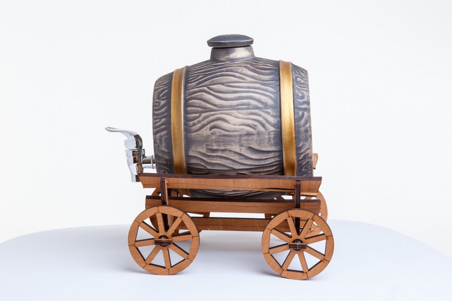 Керамическая бочка с краником выполнена из текстуры многовекового дуба и золота. Помещена на деревянную телегу ручной работы мастеров.